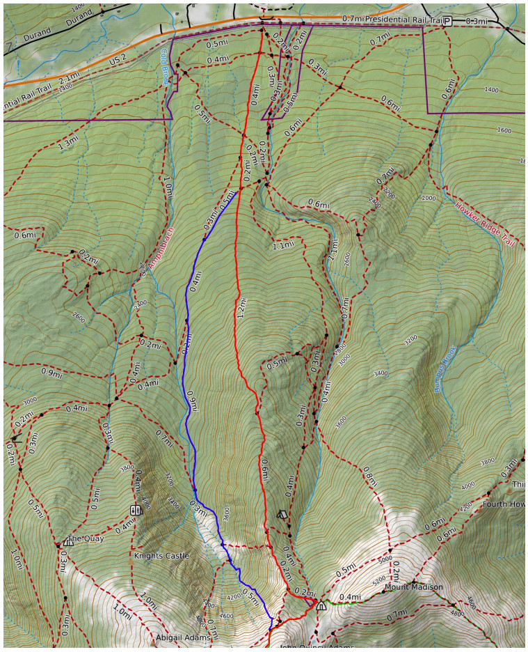 We would hike up the Airline Trail to a junction between Madison and Adams. After hiking to the top of Adams, we’d scoot down to the AMC’s Madison Spring Hut for a break, then collect Madison and make our way out via Valley Way. I estimated less than 10 miles, with an 8 hour time frame.