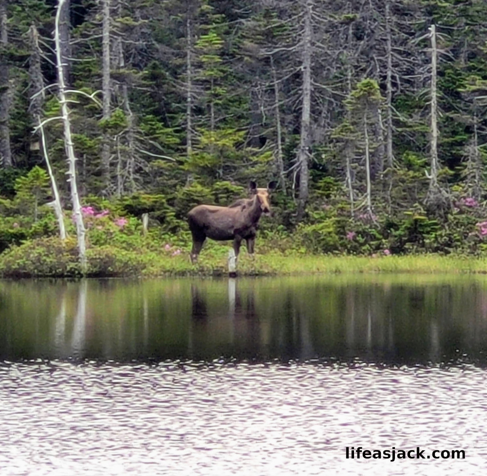 A giant female moose was feeding on the opposite shore. Easily 7 feet tall at the shoulders, she froze, watching a bird land on the lake near her. The splash landing was the only sound that broke the quiet of the lake.