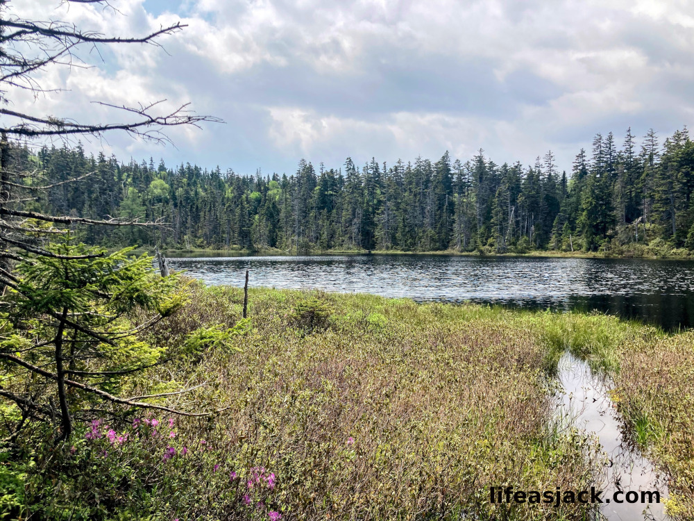 This post follows part one here. Having decided to make a second attempt to hike Nancy, I returned to Norcross Pond via the Nancy Pond Trail. Almost three months had passed, and the deep, wet, melting snow was gone. The trail around the pond was lush and green. Dragonflies buzzed past me as I made my way past my original turnaround point months before. I surveyed the pond now. The weather was warming towards a high of 70F. A few waves rippled on the lake, but it was almost silent here. I looked down. A small brown snake, pencil thin, slithered past my boot. It was no more than 6 inches long. He’d have to be an over achiever to take me out.