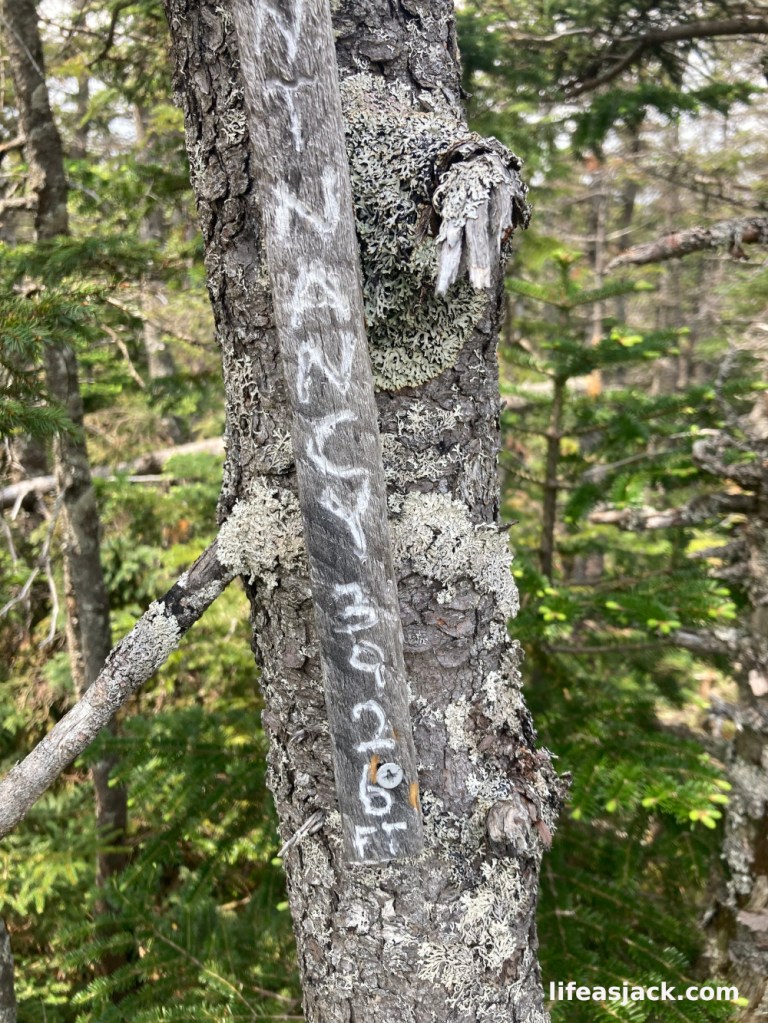The trail was farther away from the shoreline of the lake, and now was quite easy to follow. I pulled my GPS map out of my pack. I only needed to walk a few hundred yards to the point where I would have to leave the Nancy Pond Trail and venture up towards the unofficial path to the summit. Although this part of the hike was technically a bushwack, it is popular enough that an established “herd path” made by other hikers would most likely be easy to detect. There were several possibilities, but I came to one that was very obvious. Some branches had been placed across it’s entrance to discourage hikers from thinking it was the Nancy Pond Trail.
