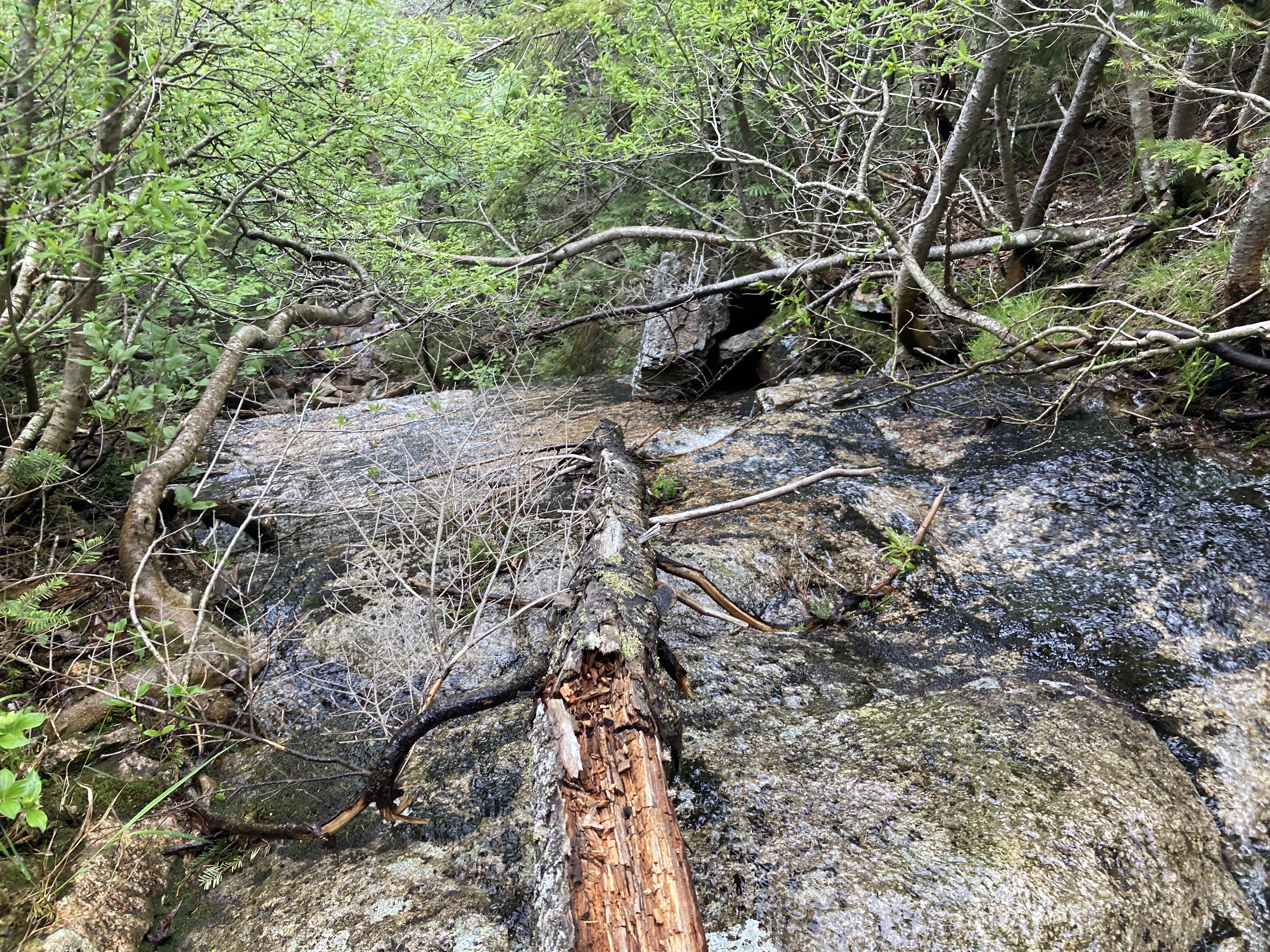 I was amazed at how wide and well defined the herd path was, and set out. There were a few “blowdowns” that presented themselves, but I easily ducked under these fallen trees. Before long, the trail began to narrow. Soon it was just shoulder width. I soon reached a stream running across the path over some wet ledges. I would have to cross it carefully. To my left, it dropped off about 40 feet.