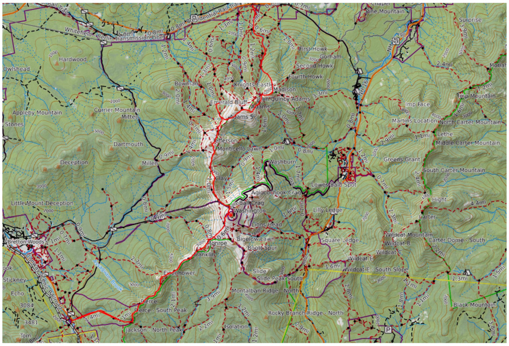 Mount Washington has a reputation as having the “worst weather in the world”. While the mountains are not the tallest or most formidable, Washington does hold the world record for highest wind speed, and if coming from a certain direction it will blow. Part of this is because its the tallest peak around. Wind coming across from the west out of the Dakotas has nothing to slow it down. The tallest Adirondacks in New York are still a thousand feet shy of Washington. That wind passes over those mountains and keeps going east, until it collides with Mount Washington. Twain or Warner were correct. New England weather is fickle. Snow in July is not impossible in the Whites. Strong thunderstorms can abruptly form on late summer afternoons. If things went wrong we’d bail out and come down with whatever we accomplished. If necessary we could stop at one of the huts located along our path operated by the Appalachian Mountain Club, at least to fill water bottles or eat.
