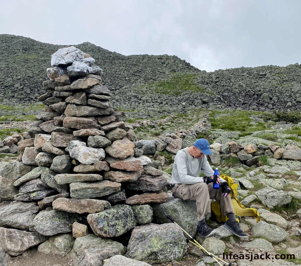 This was not my first rodeo with Mount Adams. I had hiked it with Fiona a few years earlier. Like Madison, it’s view are spectacular on a sunny day. It too is a giant pile of boulders that you climb like a mountain goat. When John and I reached the summit, I was toast. Somewhere on the steep climb I had developed a sharp cramp in my right leg, and strained an abductor muscle. it was very difficult to lift my right leg and a sharp stabbing pain hit me with each raise of my trail shoe. The summit was clouded up, and swarming with wasps,yellow jackets and every other bug imaginable. I thought to myself, “this mountain and I will never be friends.” John and I descended the peak to the Gulfside Path below.