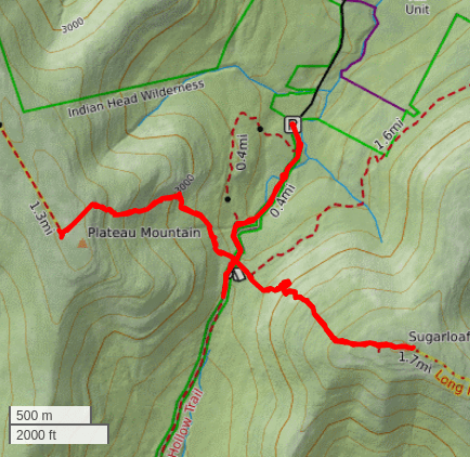 I would not have far to hike, but it would be all “up.” The one mile trip to Sugarloaf would gain 1200′ of elevation. This too would be an “out and back.” After gaining the summit I’d come out the way I had hiked in.