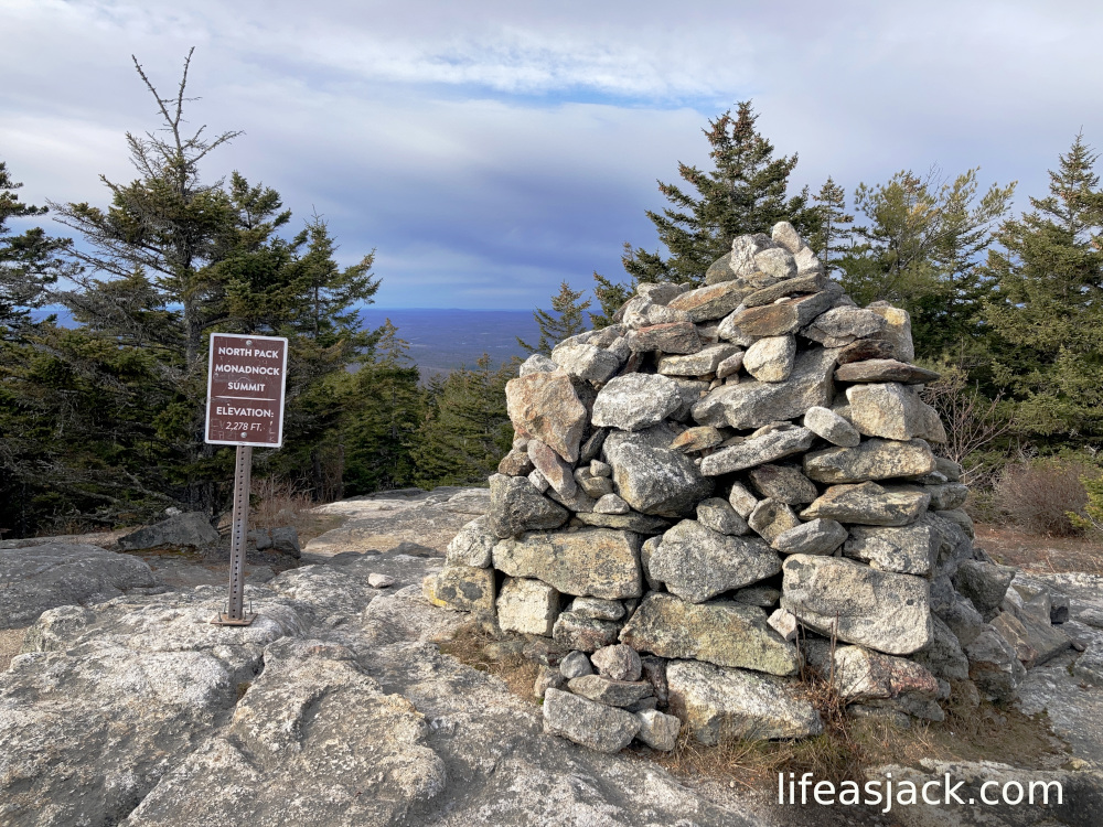 The summit of Middle Monadnock is marked by a smaller cairn, and it does not have a view. I didn’t pause there, but continued on to Pack.