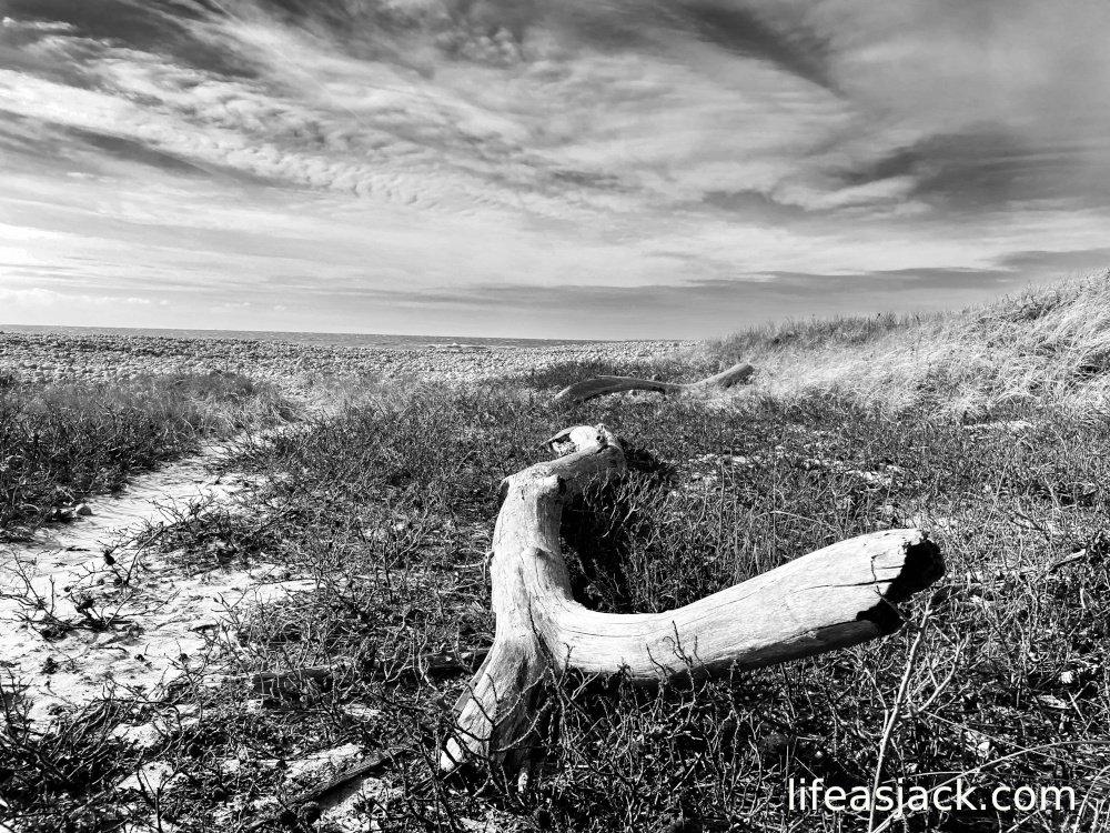 I found a route through to the shore, passing driftwood bleached white by the sun, as if the bones of an ancient giant lay in the sea grasses.