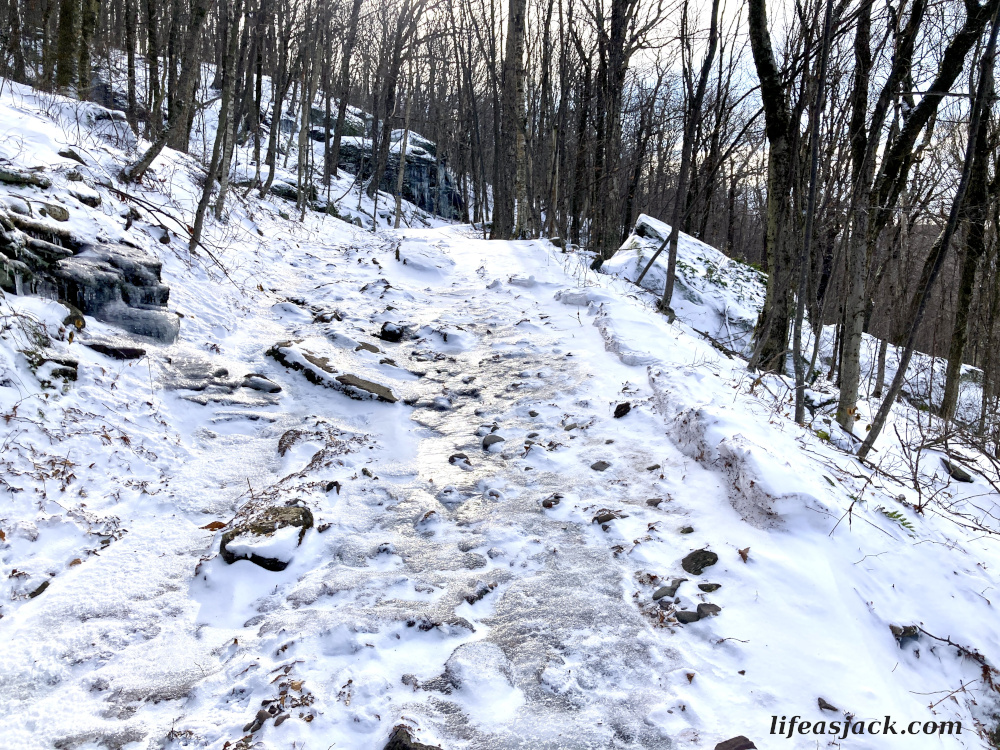 A few inches of snow covered the ground. The parking area was nearly empty. I’d borrowed a car to make the drive, and left it behind, crossing the road to the trail.