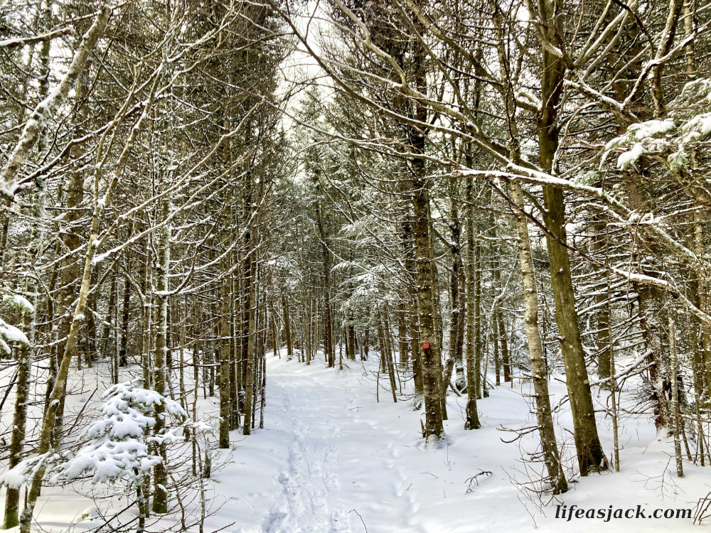 Exiting the Dry Brook Trail, (blue blazes) I turned right onto the Balsam Lake Trail (blazed red). The snow was undisturbed here but for a single set of tracks. The young hiker who had passed me had put on her snowshoes, and I did the same. I was glad to have her in front of me doing the initial trail breaking.