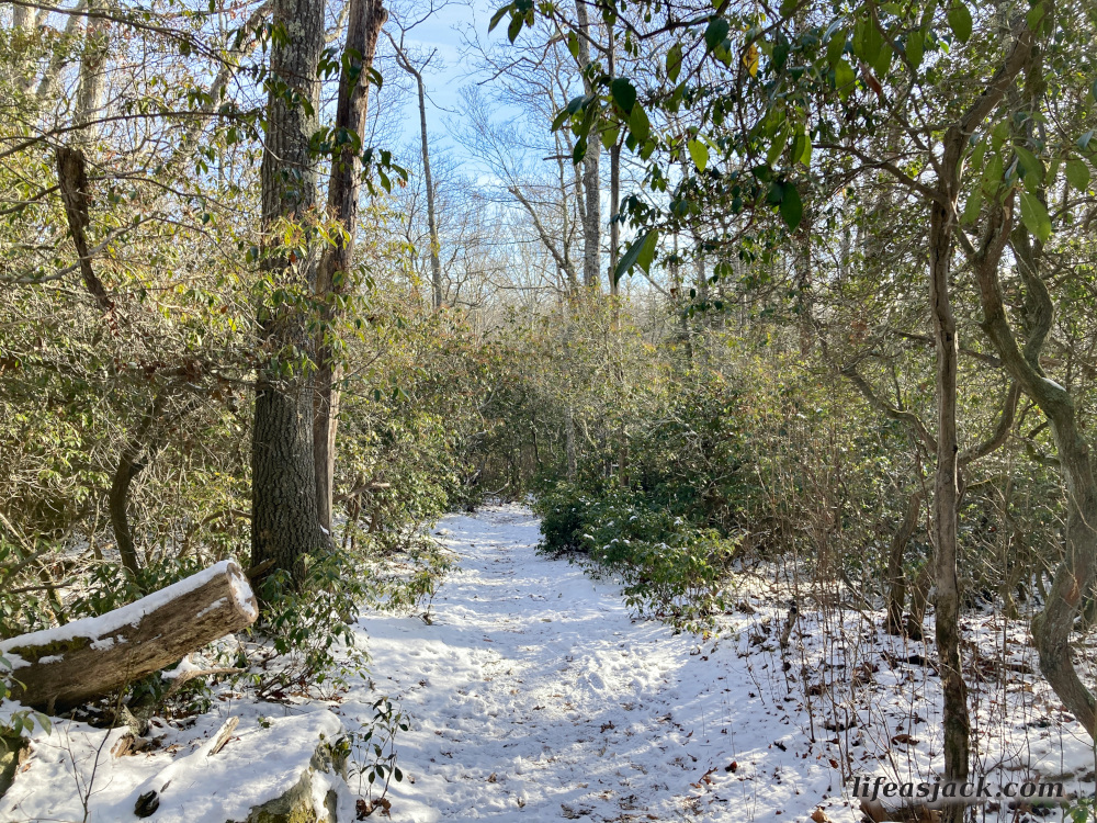 Walking on a warmer than normal day 33F/1C. Along the edges of the trail, Mountain Laurel gives the eyes and spirit a lift in winter. The evergreen shrub is a welcome respite from the leafless trees, brown lifeless fallen leaves and bare thickets. The nature preserve in Rhode Island is well marked with many trails and allows for some easy walking.