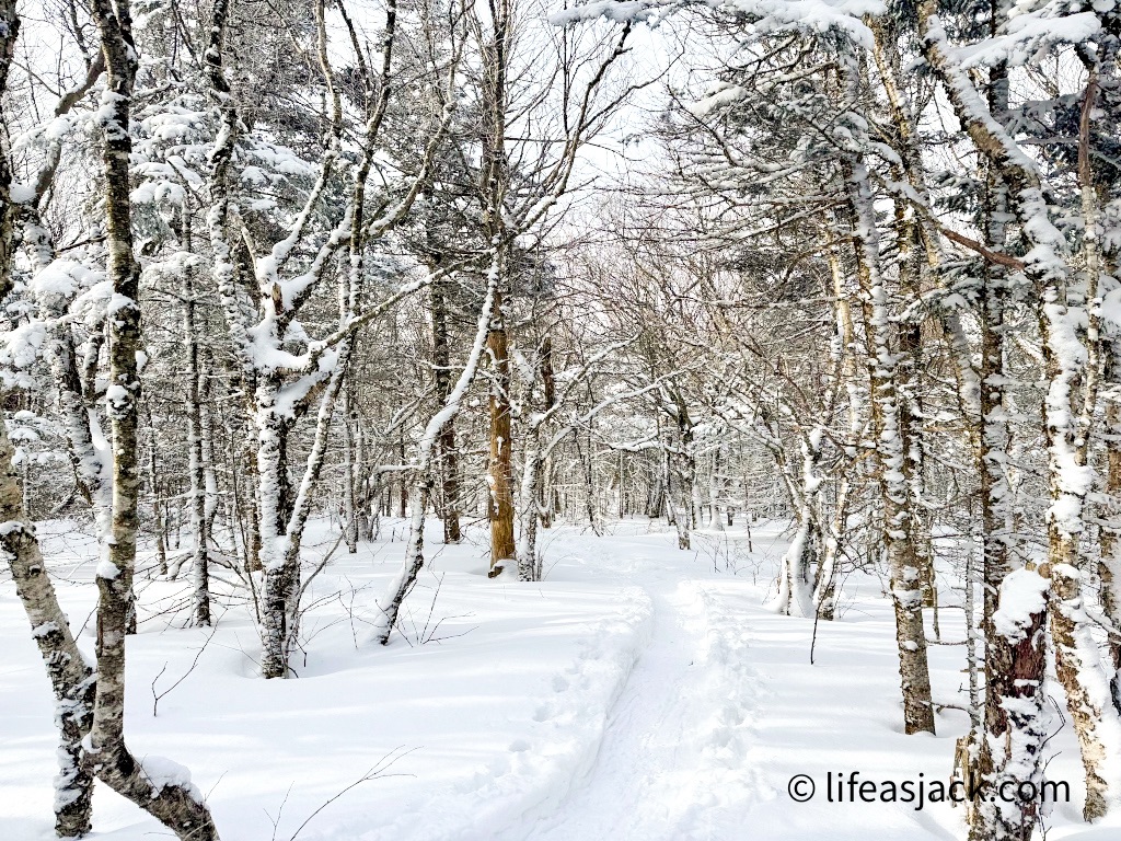 I stood at the summit of Balsam Mountain. Taking a breath and sip of water, I hitched up my pack and began to travel back the way I had come. The morning hike from the Rider Hollow Trailhead had been excellent. Fine weather in the 30’s and a well established snowshoe trench had made travel to the summit relatively painless. Now I returned the way I had come, stopping at the ridge line trail junction.