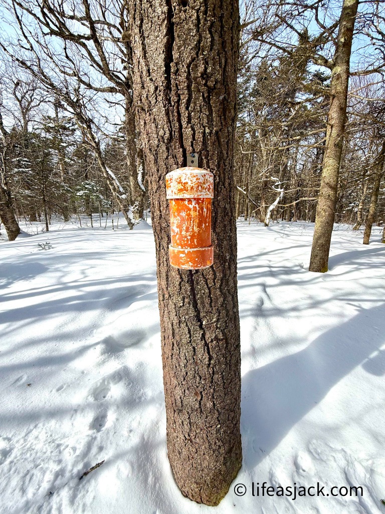Soon I entered a stand of trees. They had been blasted by a recent snowfall. The sticky snow stuck to trunk and branch. It was a beautiful scene, and I began to look for signs of the summit canister.